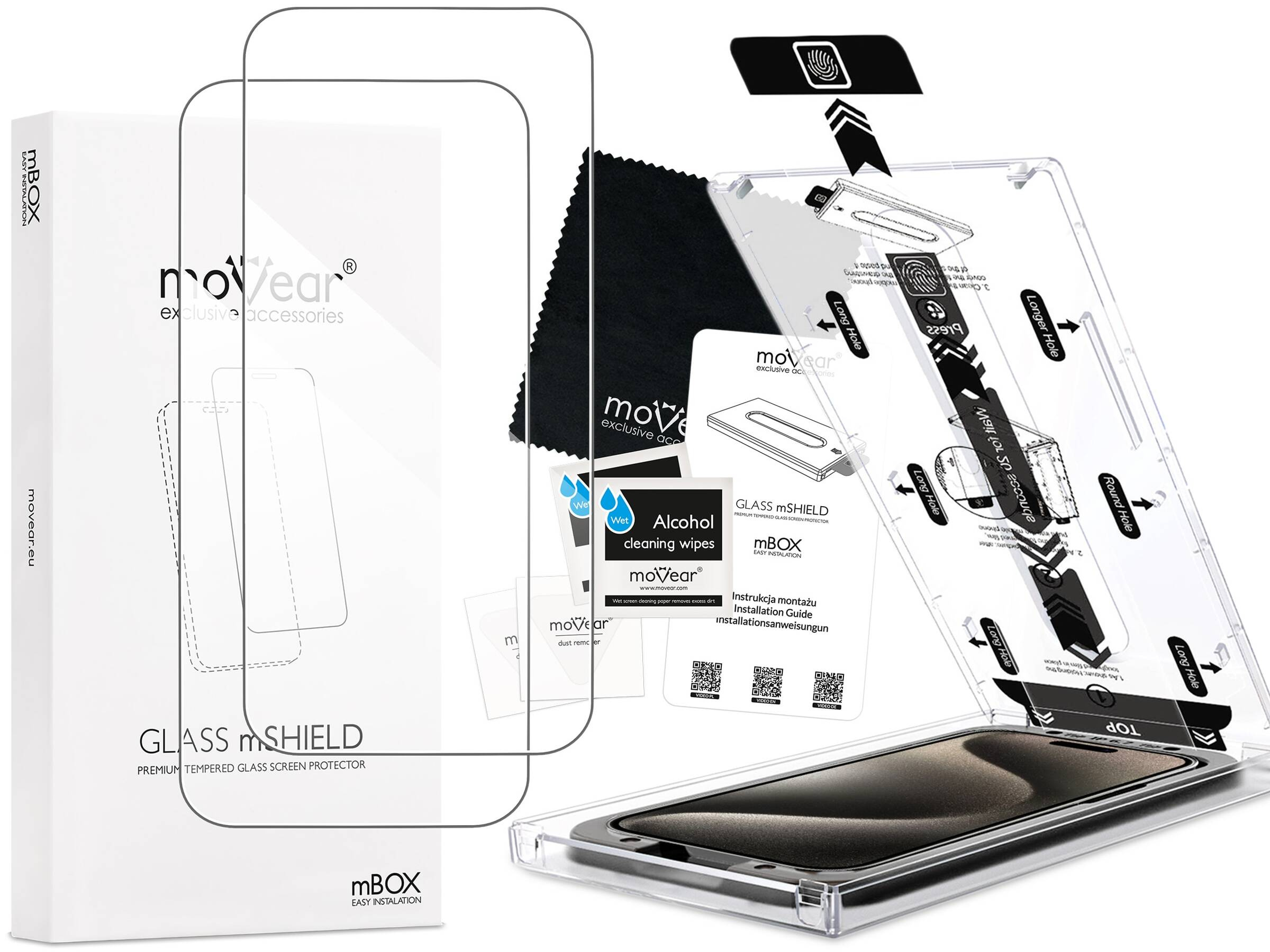 moVear mBOX GLASS mSHIELD 2.5DSzkło hartowane na Apple iPhone 16 / 15 / 15 Pro (6.1"), z systemem łatwego montażu2 sztuki szkła w opakowaniu