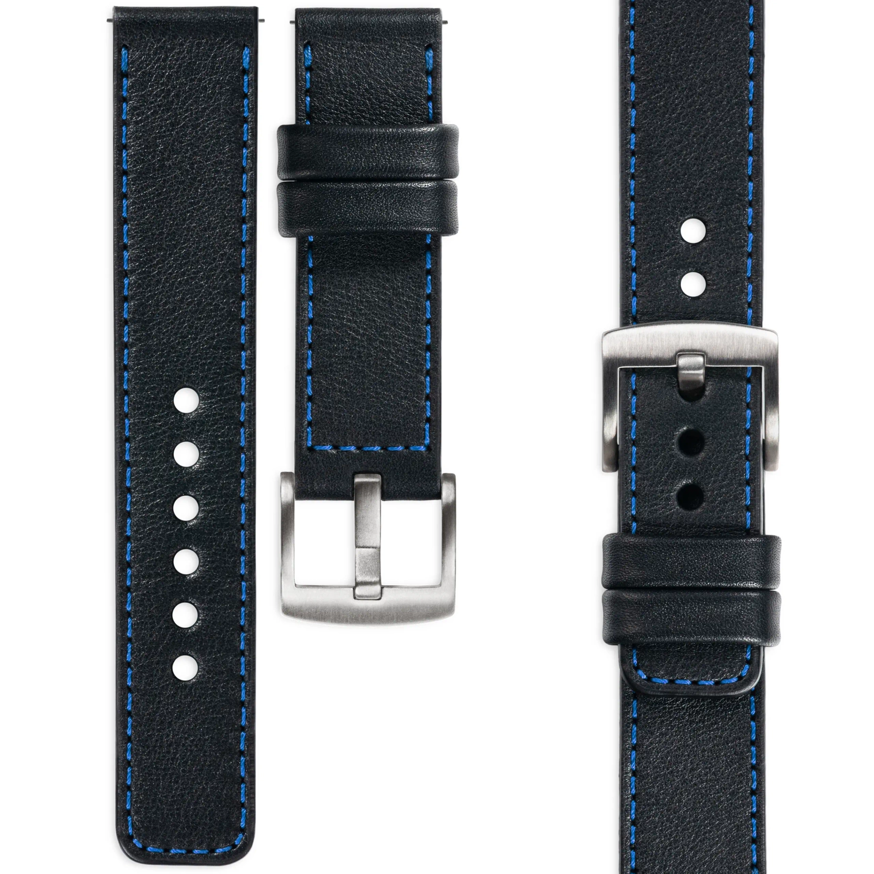 moVear Prestige C1 Skórzany pasek 21mm do zegarka / smartwatcha | Czarny, eleganckie przeszycie kolor Niebieski
