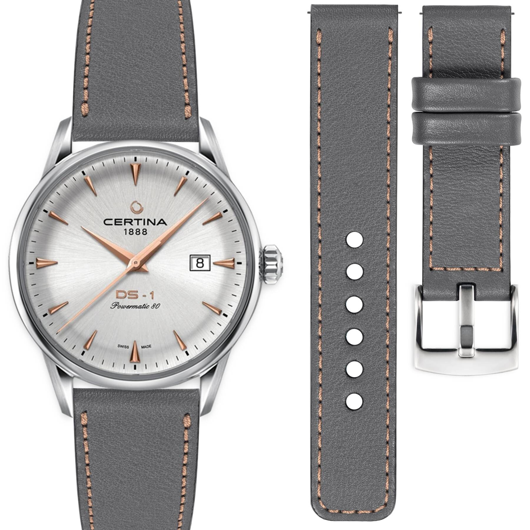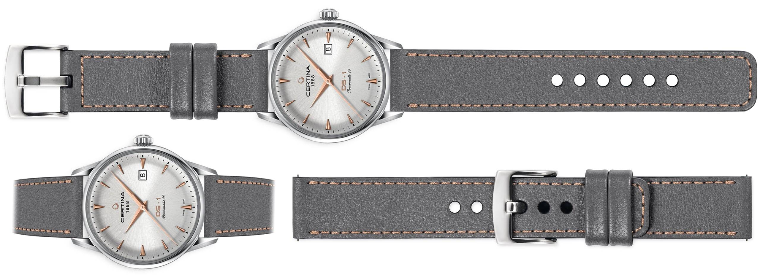 • Szary skórzany pasek do Certina DS-1 C029.807.16.031.01, różowe złoto eleganckie przeszycie. Dostępny w różnych rozmiarach (XS-XXL). Wykonany w Polsce. Klamra ze stali nierdzewnej.