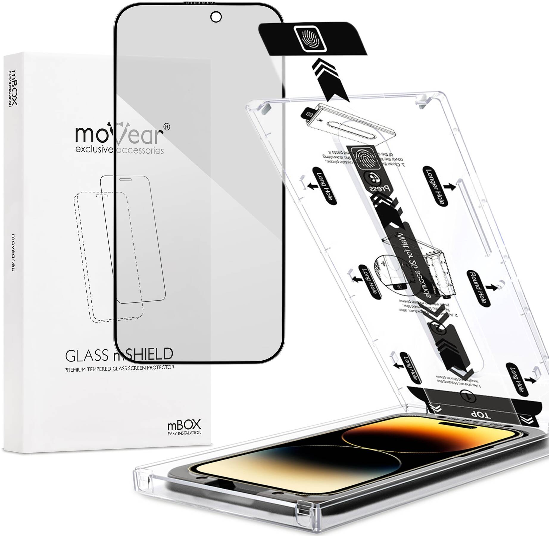 moVear mBOX GLASS mSHIELD 2.5D MAX privacySzkło hartowane na Apple iPhone 14 Pro (6.1"), z aplikatorem, filtr prywatyzujący
