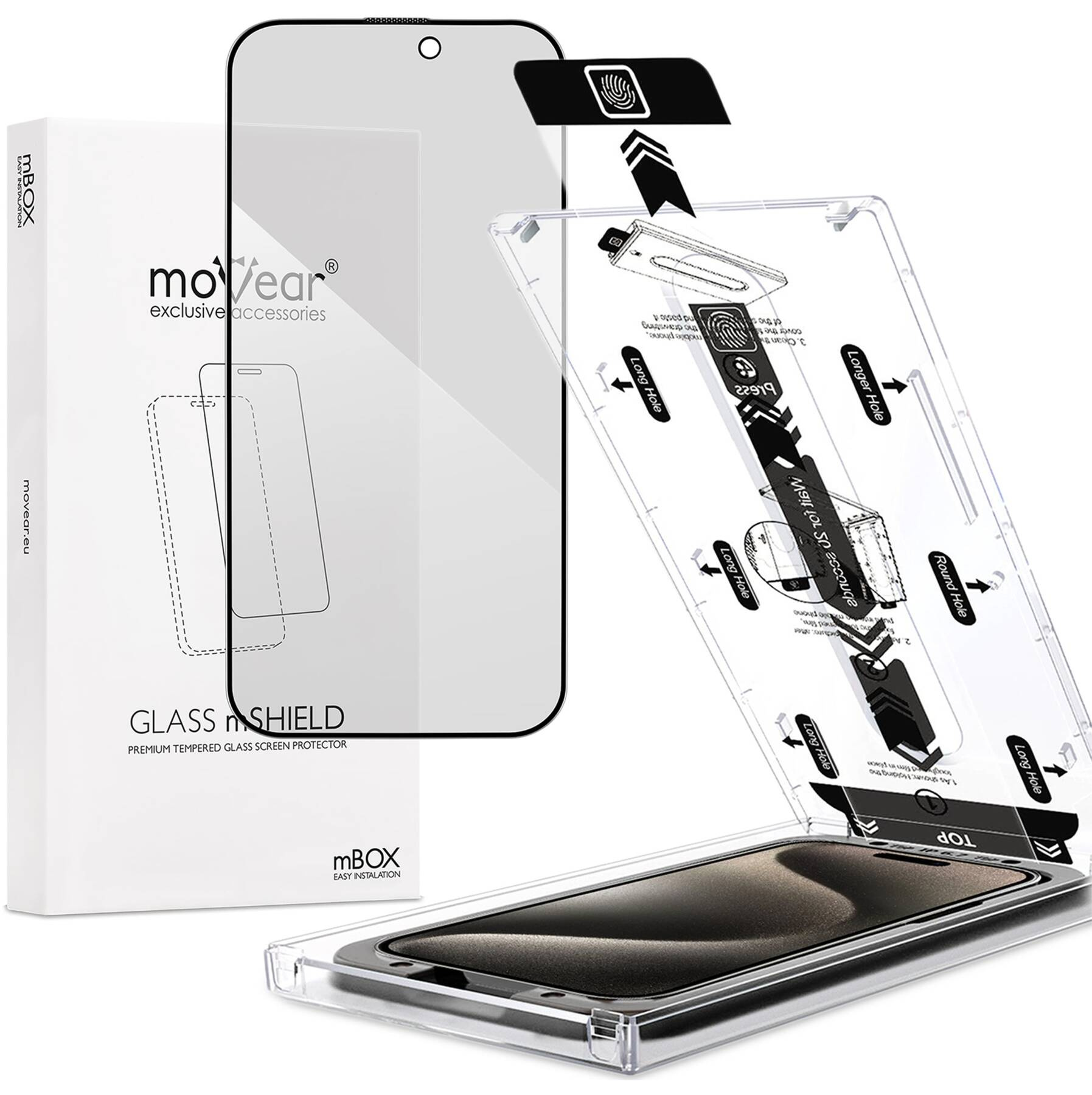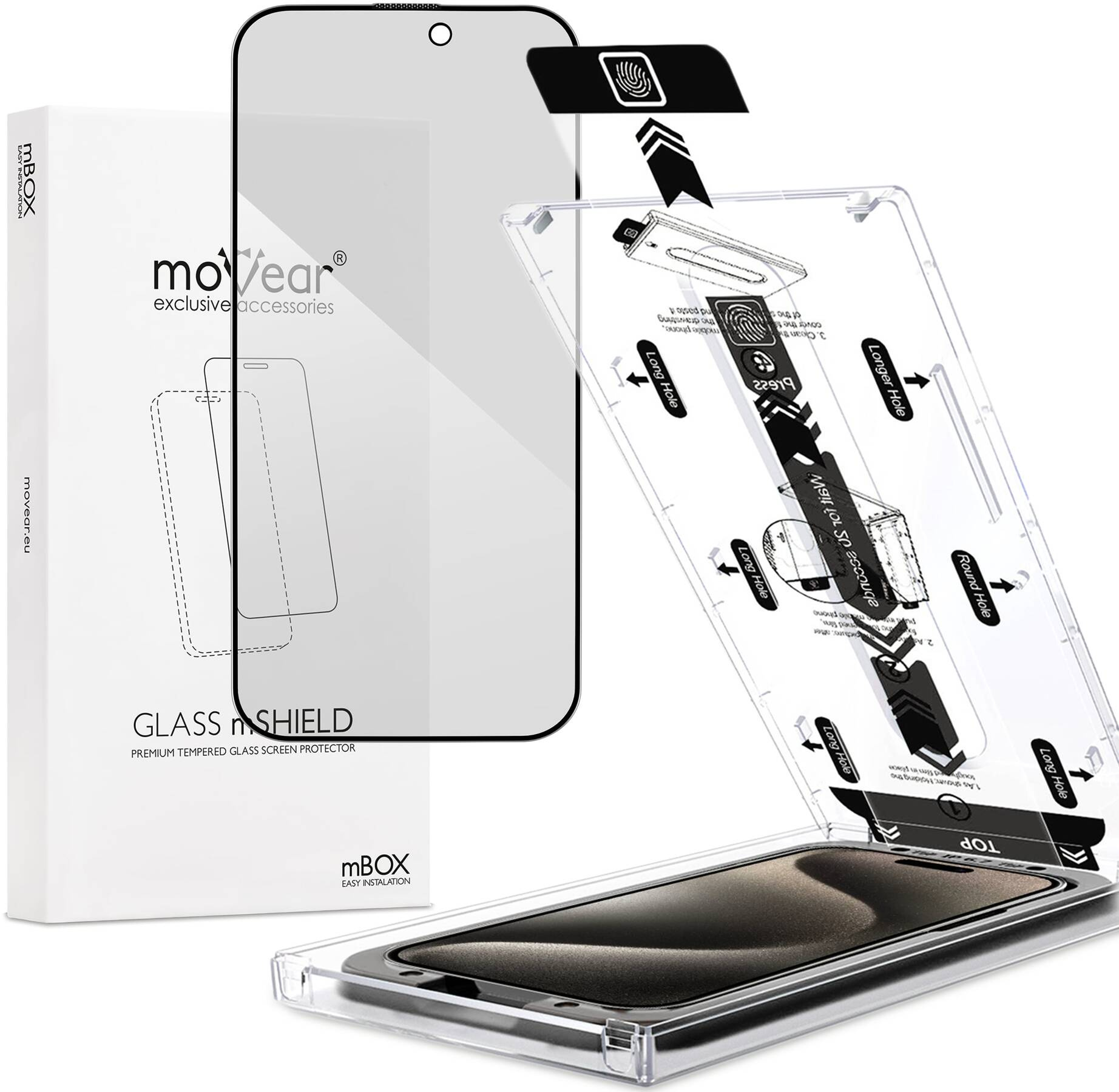 moVear mBOX GLASS mSHIELD 2.5D MAX privacySzkło hartowane na Apple iPhone 15 Pro (6.1"), z aplikatorem, filtr prywatyzujący