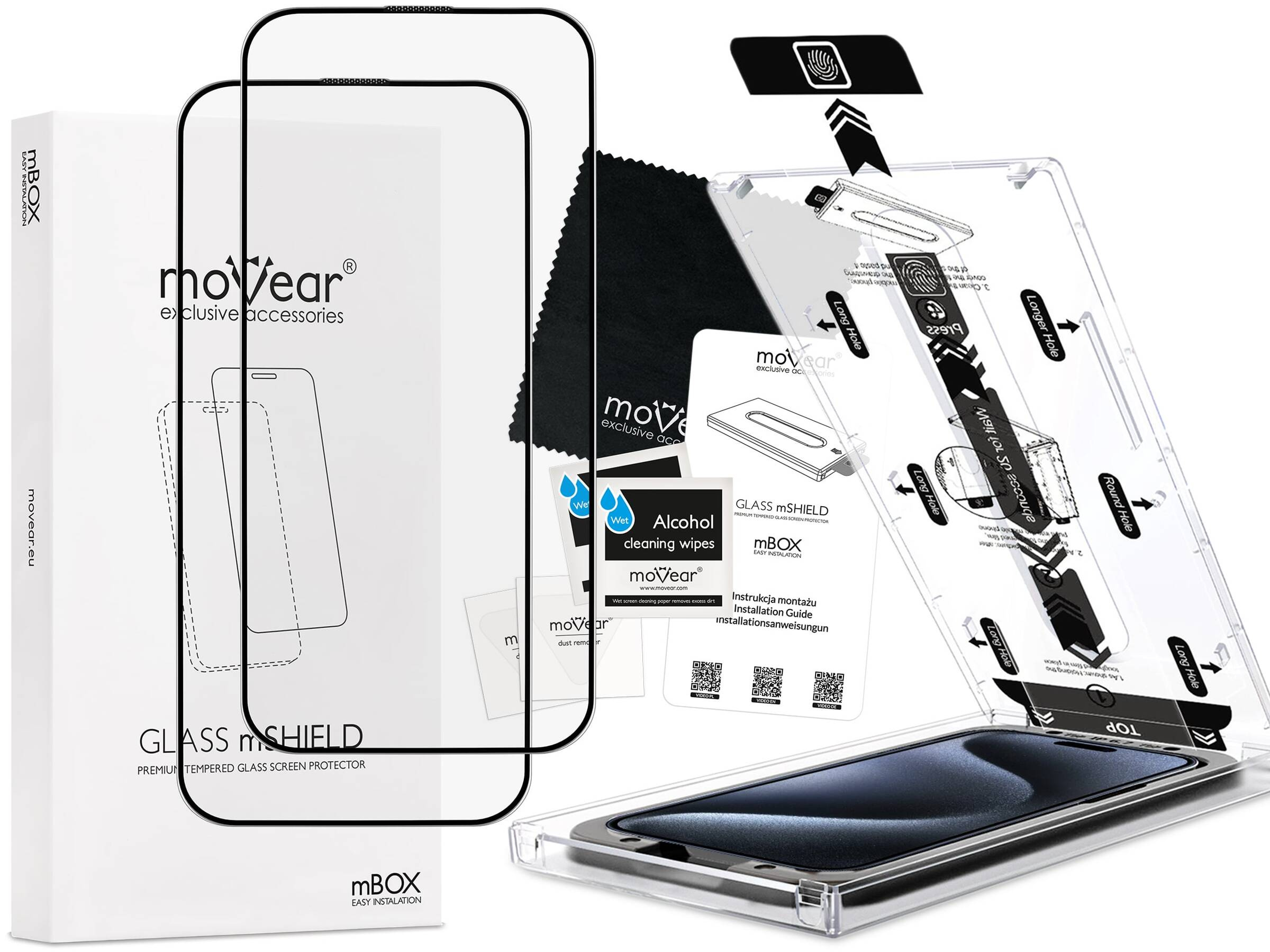 moVear mBOX GLASS mSHIELD 2.5D MAX MATTSzkło hartowane na Apple iPhone 15 Pro Max (6.7"), antyrefleksyjna powierzchnia, z systemem łatwego montażu2 sztuki szkła w opakowaniu