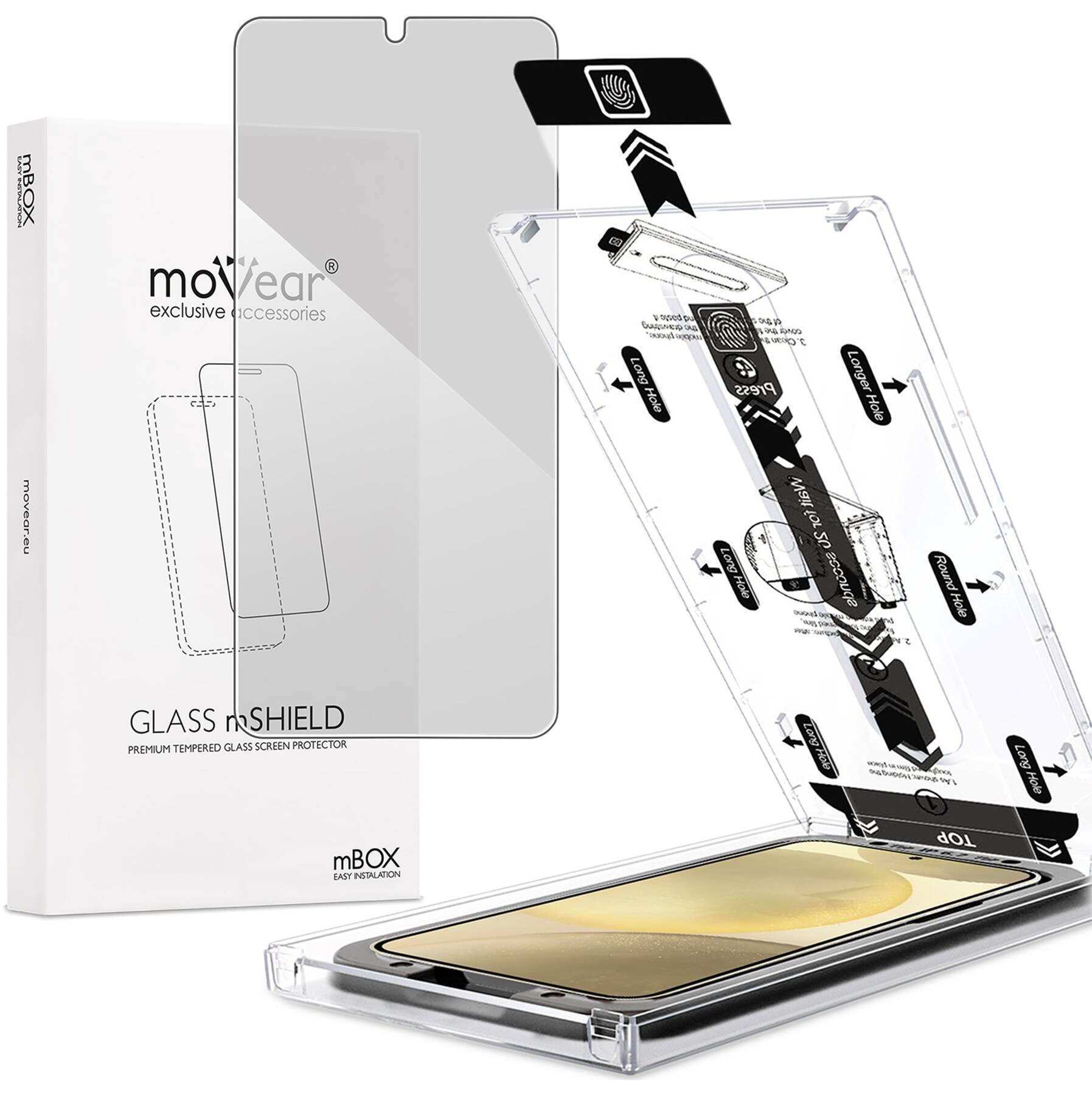 moVear mBOX GLASS mSHIELD 2.5D privacySzkło hartowane na Samsung Galaxy S25+ / S24+ (Plus) (6.7"), z systemem łatwego montażu