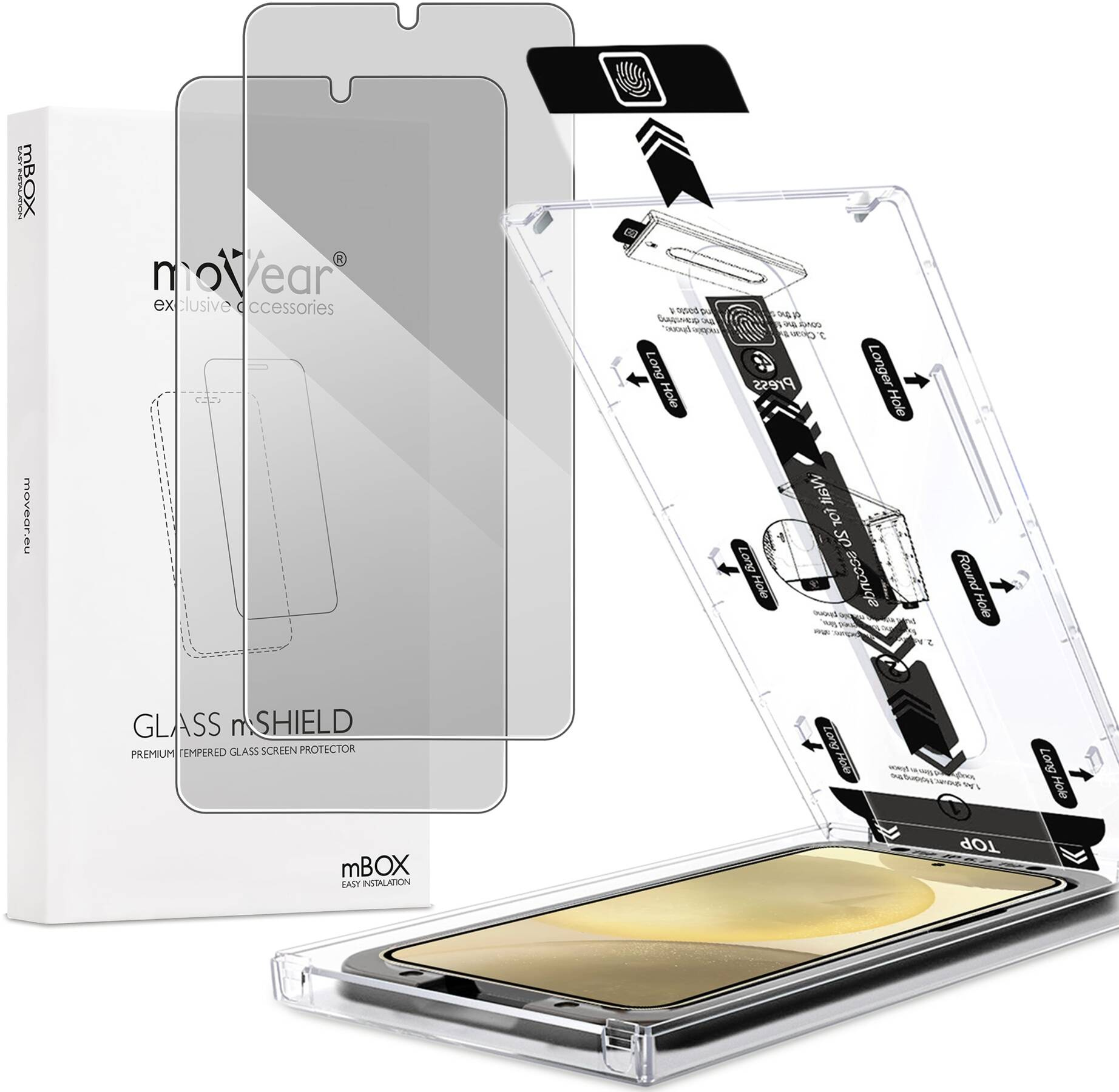 moVear mBOX GLASS mSHIELD 2.5D privacySzkło hartowane na Samsung Galaxy S25+ / S24+ (Plus) (6.7"), z systemem łatwego montażu2 sztuki szkła w opakowaniu