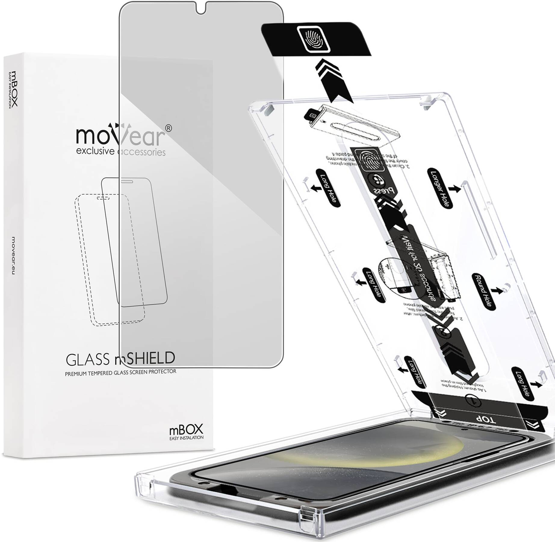 moVear mBOX GLASS mSHIELD 2.5D privacySzkło hartowane na Samsung Galaxy S25 / S24 (6.2"), z systemem łatwego montażu