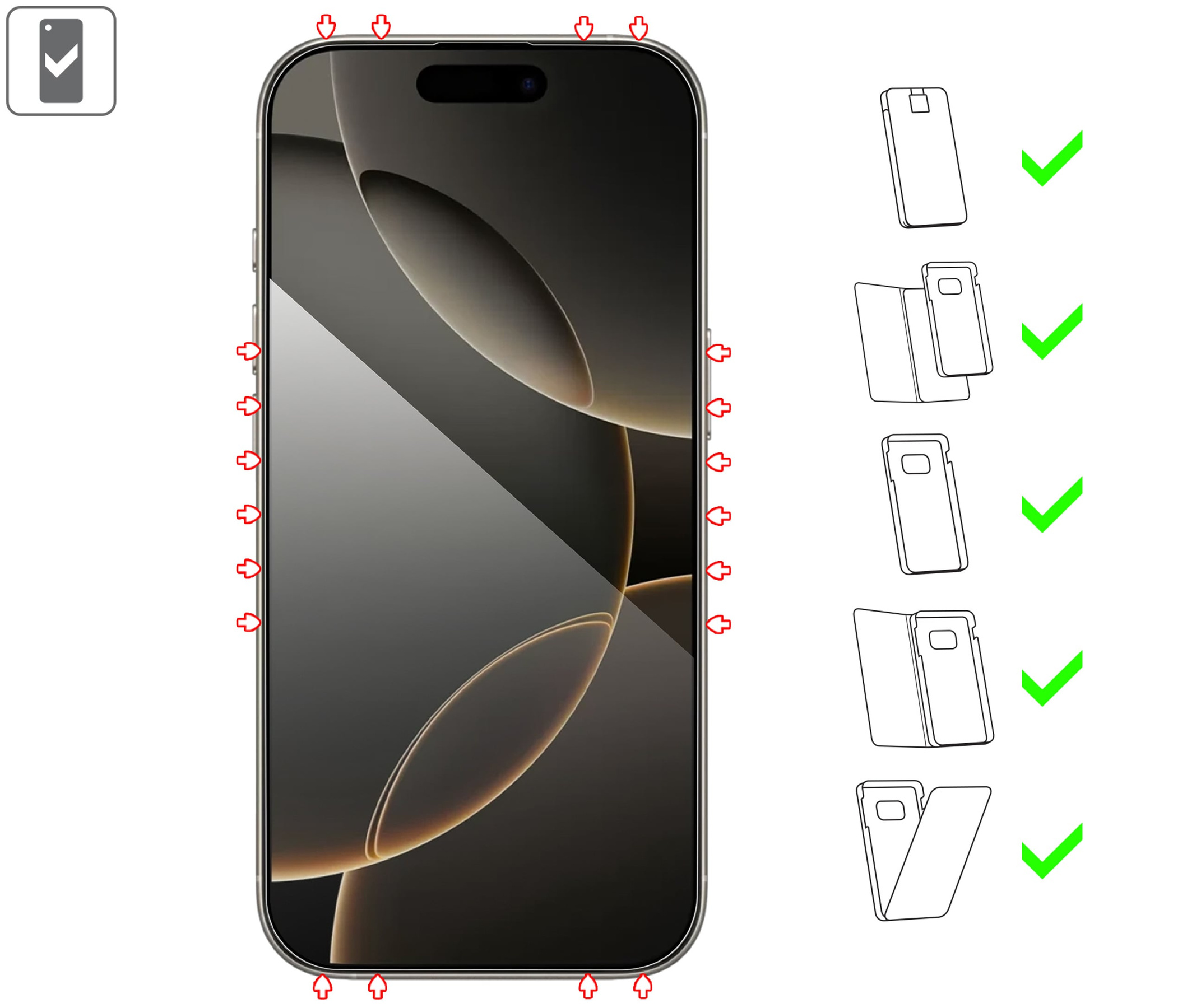 Połączenie warstw, zmniejsza podatność na pęknięcia i rozkruszenie. Pochłania energię uderzeń, zapewnia ochronę ekranu Apple iPhone 17 Pro / 17 / 16 Pro (6.3") i zmniejsza ryzyko uszkodzeń wyświetlacza podczas upadku smartfona.