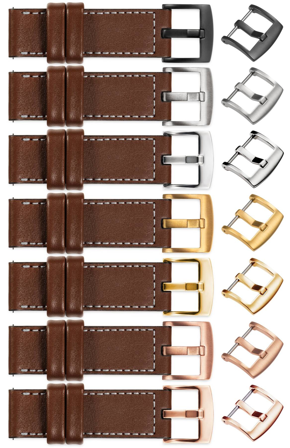 moVear Prestige CW1 Szeroki skórzany pasek 18mm do zegarka | Ciemnobrązowy, białe przeszycie [rozmiary XS-XXL i klamra do wyboru]