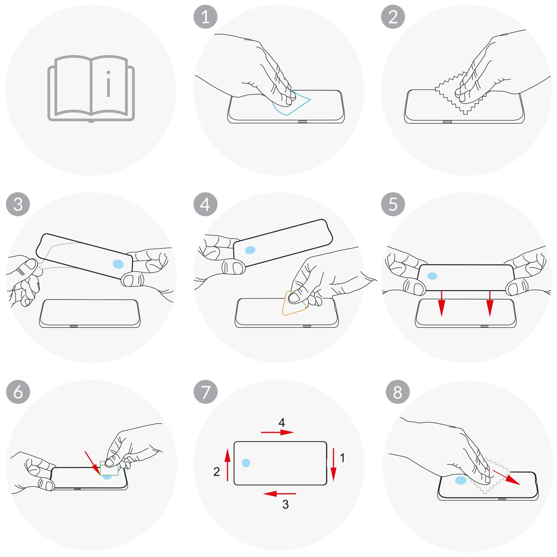 - Następnie dociśnij szkło zgodnie z kolejnością oznaczoną na rysunku, naciskając i jednocześnie przesuwając palcem po zaznaczonych obszarach z klejem. Czynność należy powtórzyć kilka razy.