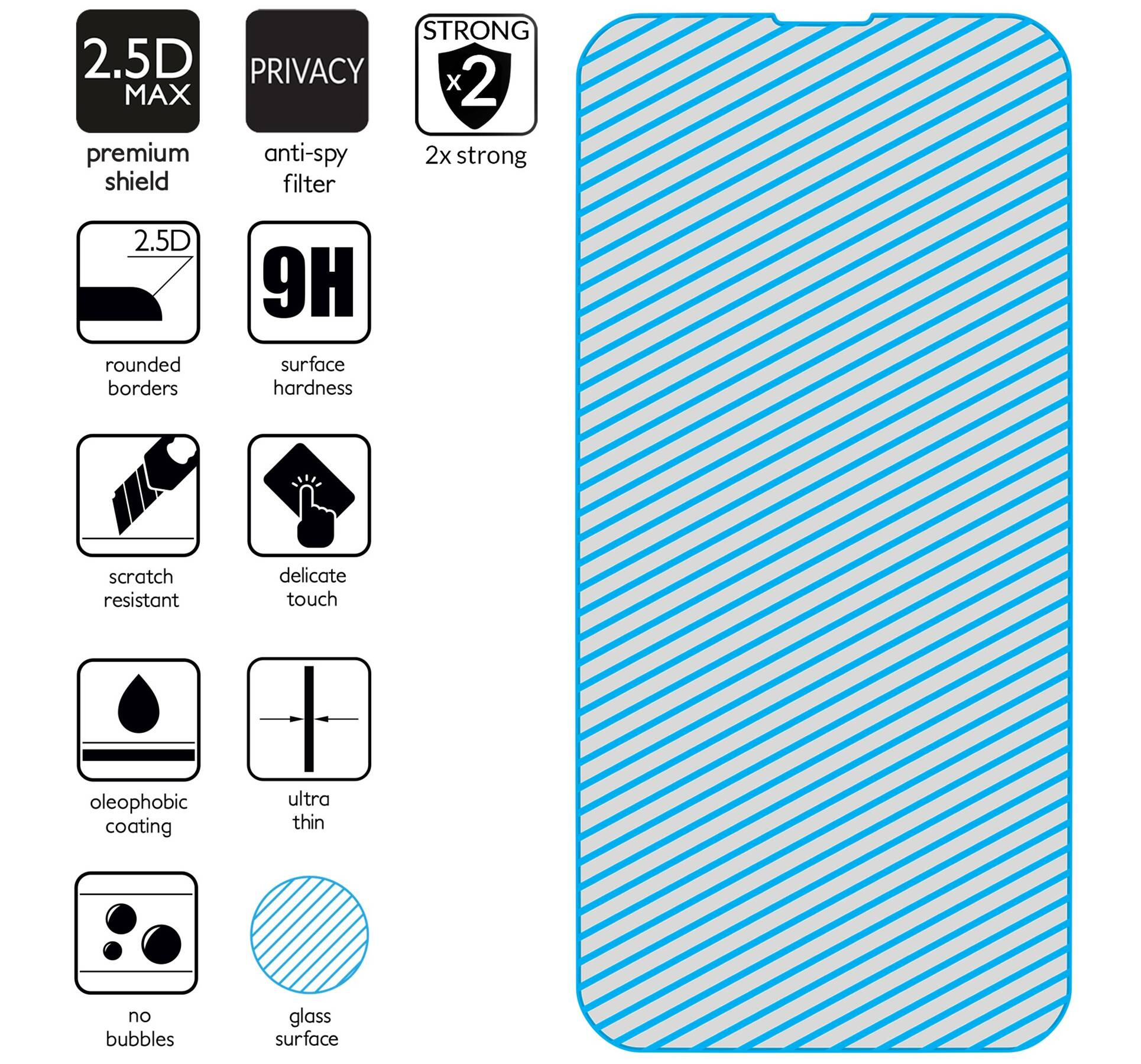 Szkło na cały ekran GLASS mSHIELD 2.5D MAX privacy do iPhone 14 Plus / 13 Pro Max zostało zaprojektowane i wycięte z marginesem pozwalającym na użytkowanie szkła moVear z większą ilością etui i pokrowców*. Optymalne wymiary zapewniają prawidłowe przyleganie szkła hartowanego na całej jego powierzchni. (*W przypadku wątpliwości prosimy o kontakt). < br/> UWAGA! Obecnie wiele nowoczesnych smartfonów posiada ekrany charakteryzujące się lekkim zakrzywieniem powierzchni. Szkło 2.5D MAX privacy jest większe od klasycznego szkła 2.5D a jednocześnie trochę mniejsze niż szkło 3D. Dzięki czemu jest kompatybilne z większą ilością etui.