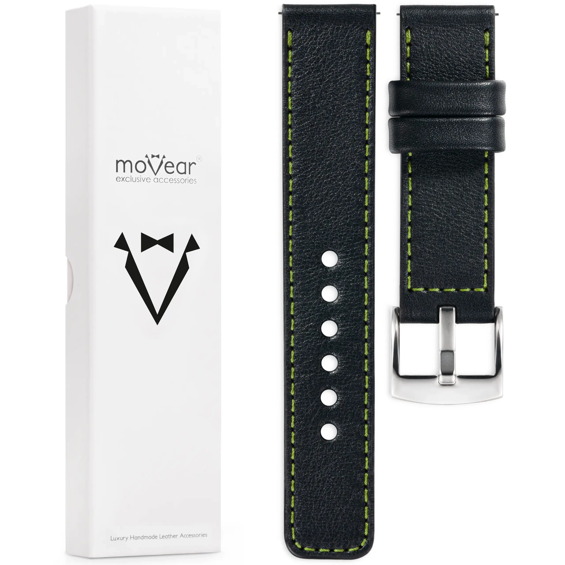 - 1 szt. moVear Prestige C1 - Skórzany pasek szerokości mocowania 26mm, kolor paska Czarny, limonkowe przeszycie