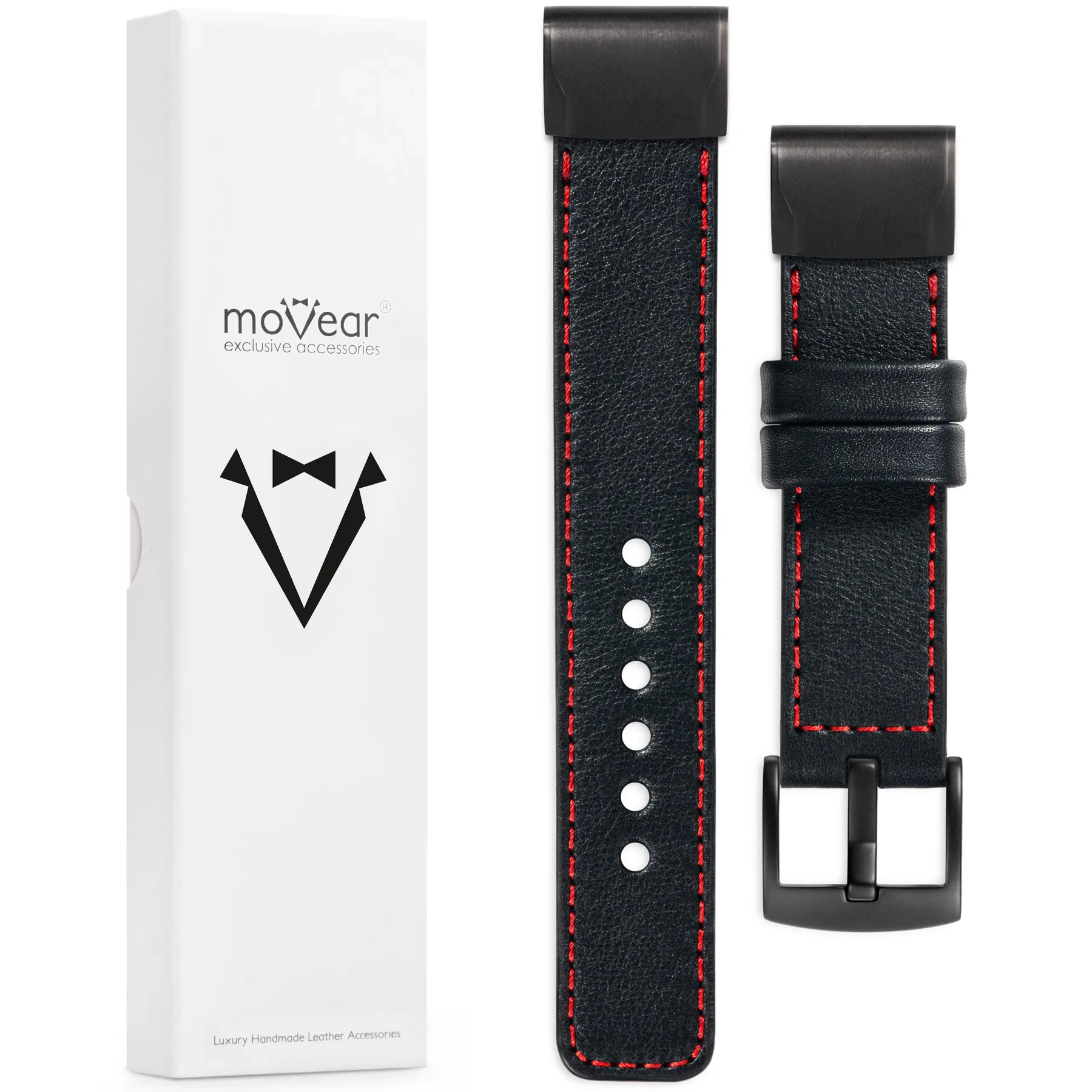 moVear Prestige C1 Skórzany pasek do Garmin QuickFit 20mm (Fenix / Instinct - 43/42/40mm) | Czarny, czerwone przeszycie [rozmiary XS-XXL i klamra do wyboru]