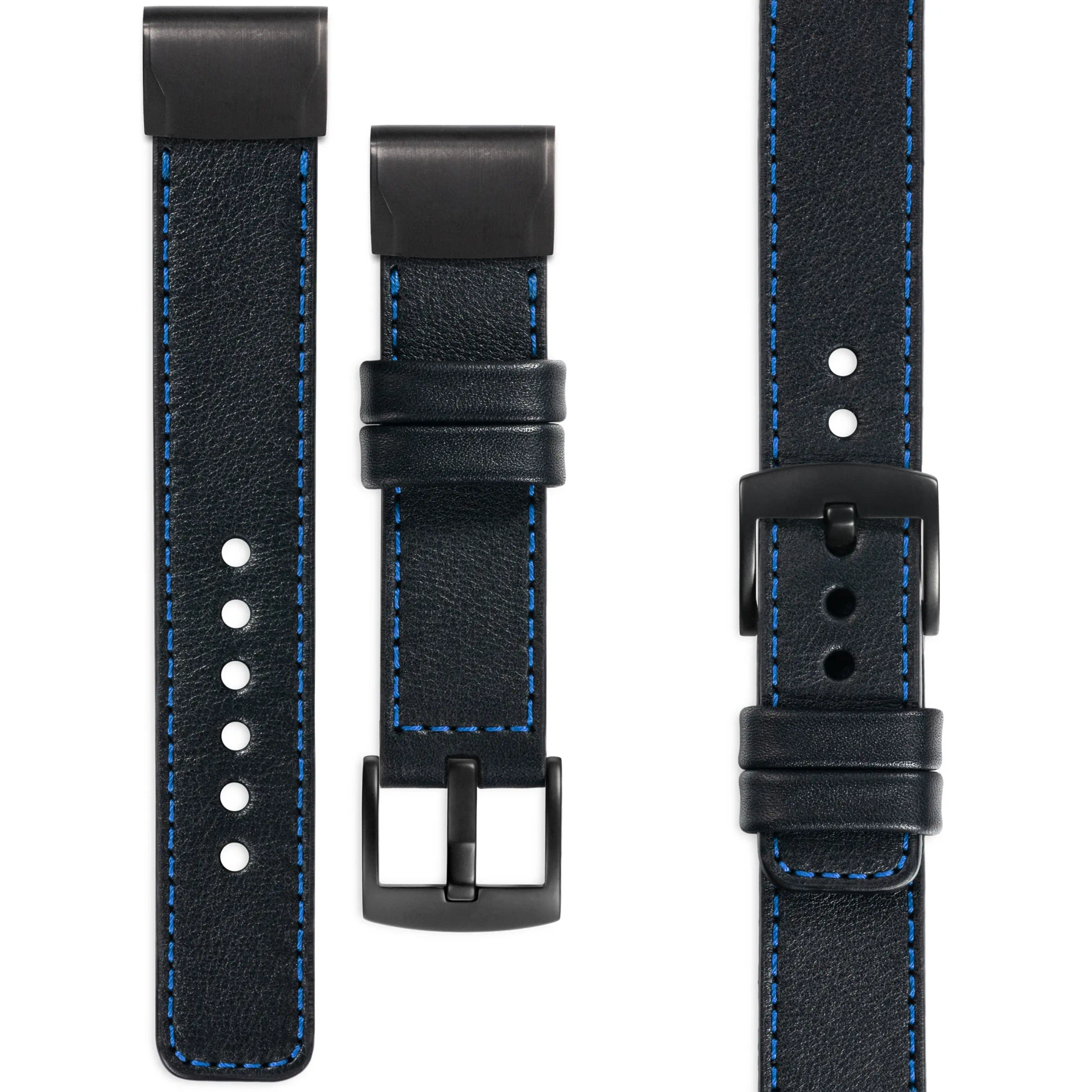 moVear Prestige C1 | Skórzany pasek do Garmin QuickFit 20mm (Fenix / Instinct - 43/42/40mm) | Czarny, eleganckie przeszycie kolor Niebieski