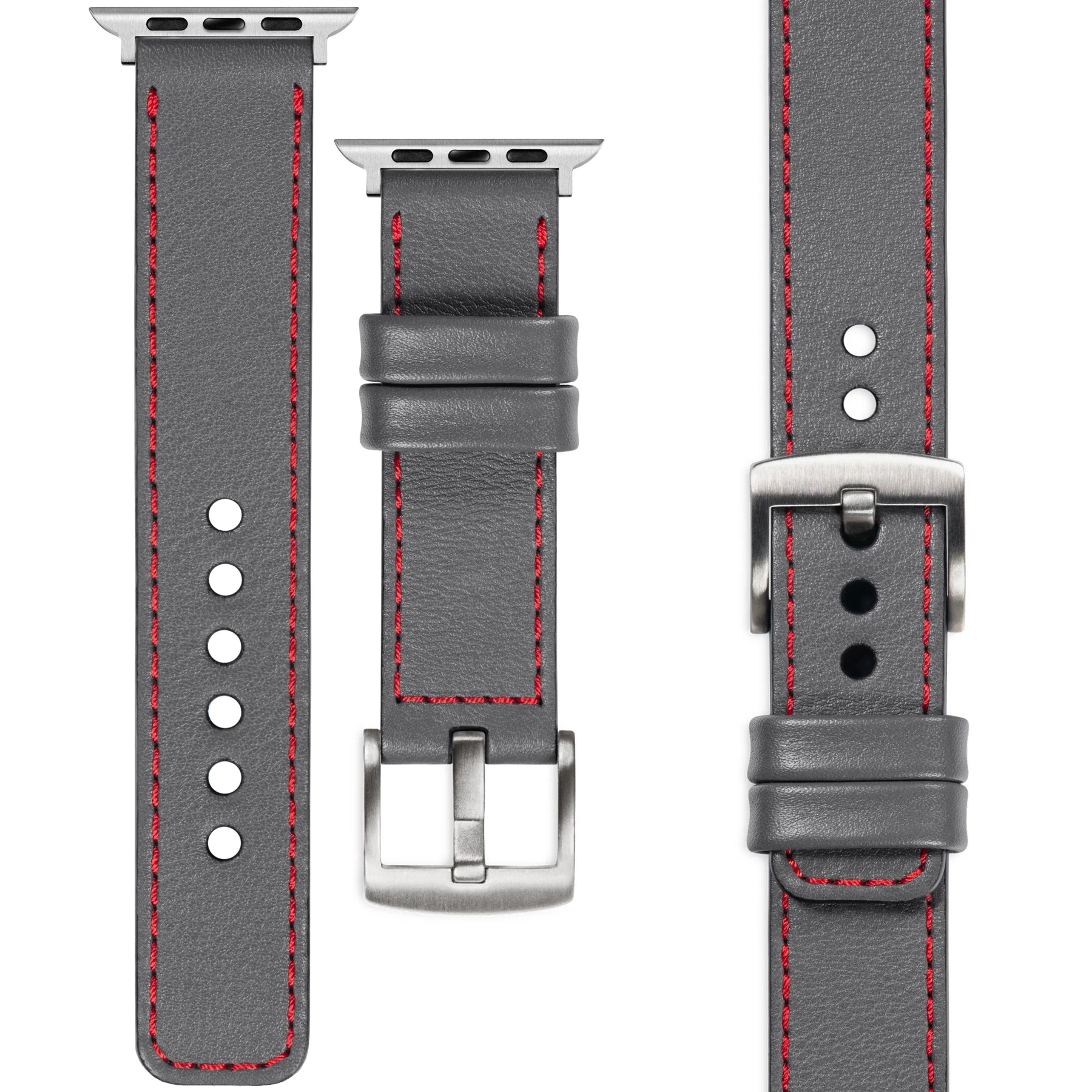 moVear Prestige C1 | Skórzany pasek 24mm do Apple Watch 10 / 9 / 8 / 7 / 6 / 5 / 4 / SE (46/45/44mm) & Ultra (49mm) | Szary, eleganckie przeszycie kolor Czerwony