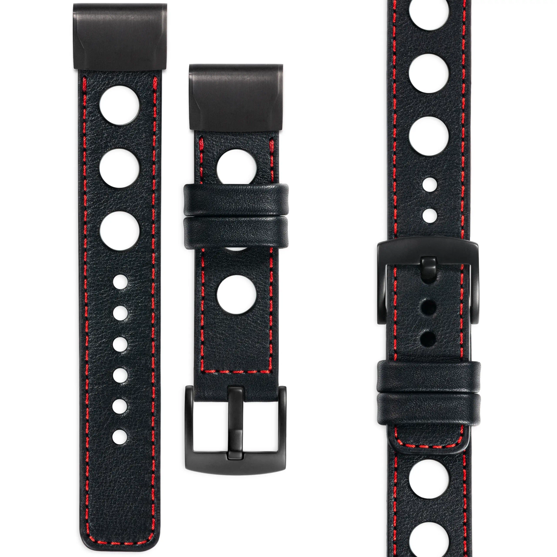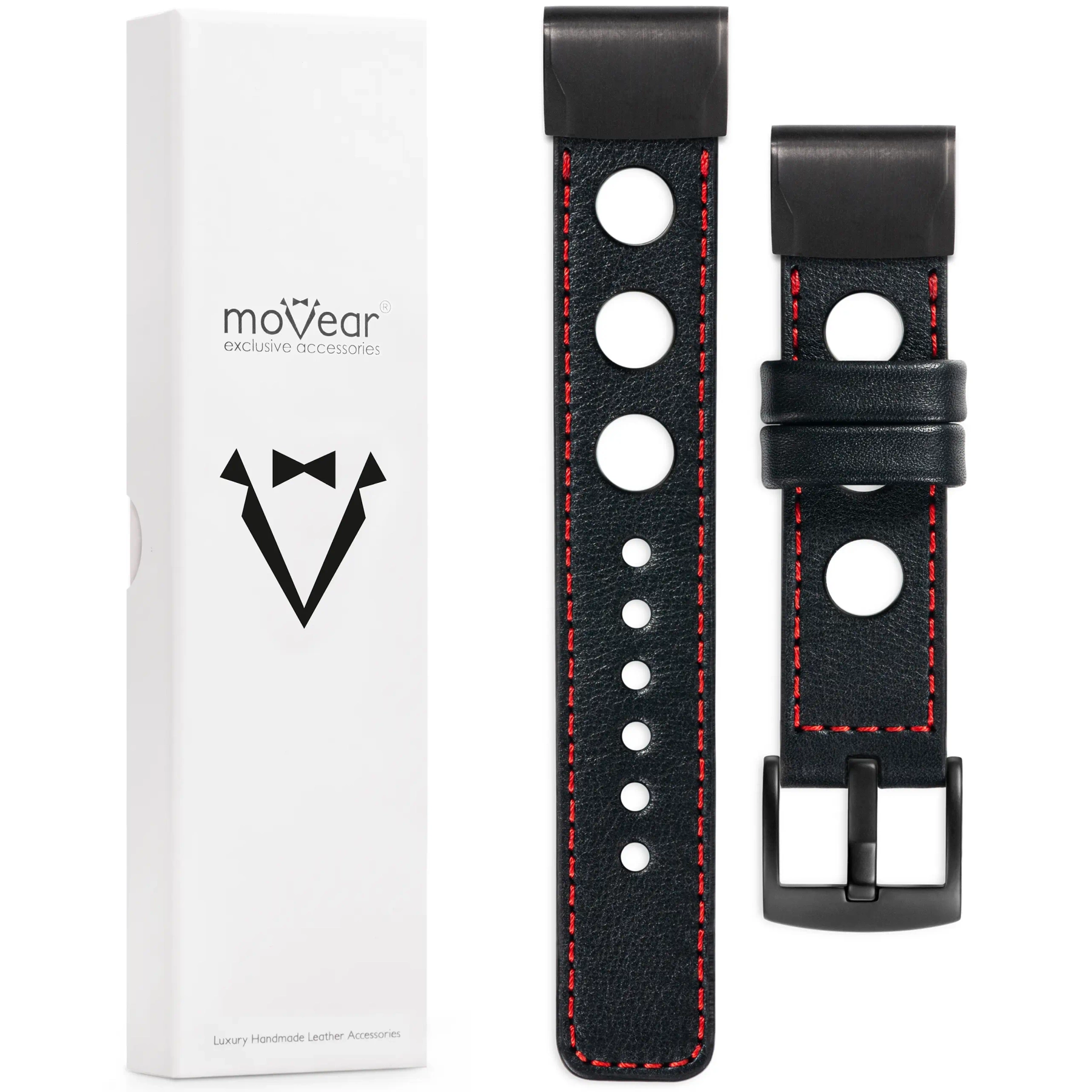 moVear Prestige R1 | Skórzany pasek do Garmin QuickFit 26mm (Fenix / Epix / Quatix / Tactix / Enduro - 51mm) | Czarny, eleganckie przeszycie kolor Czerwony