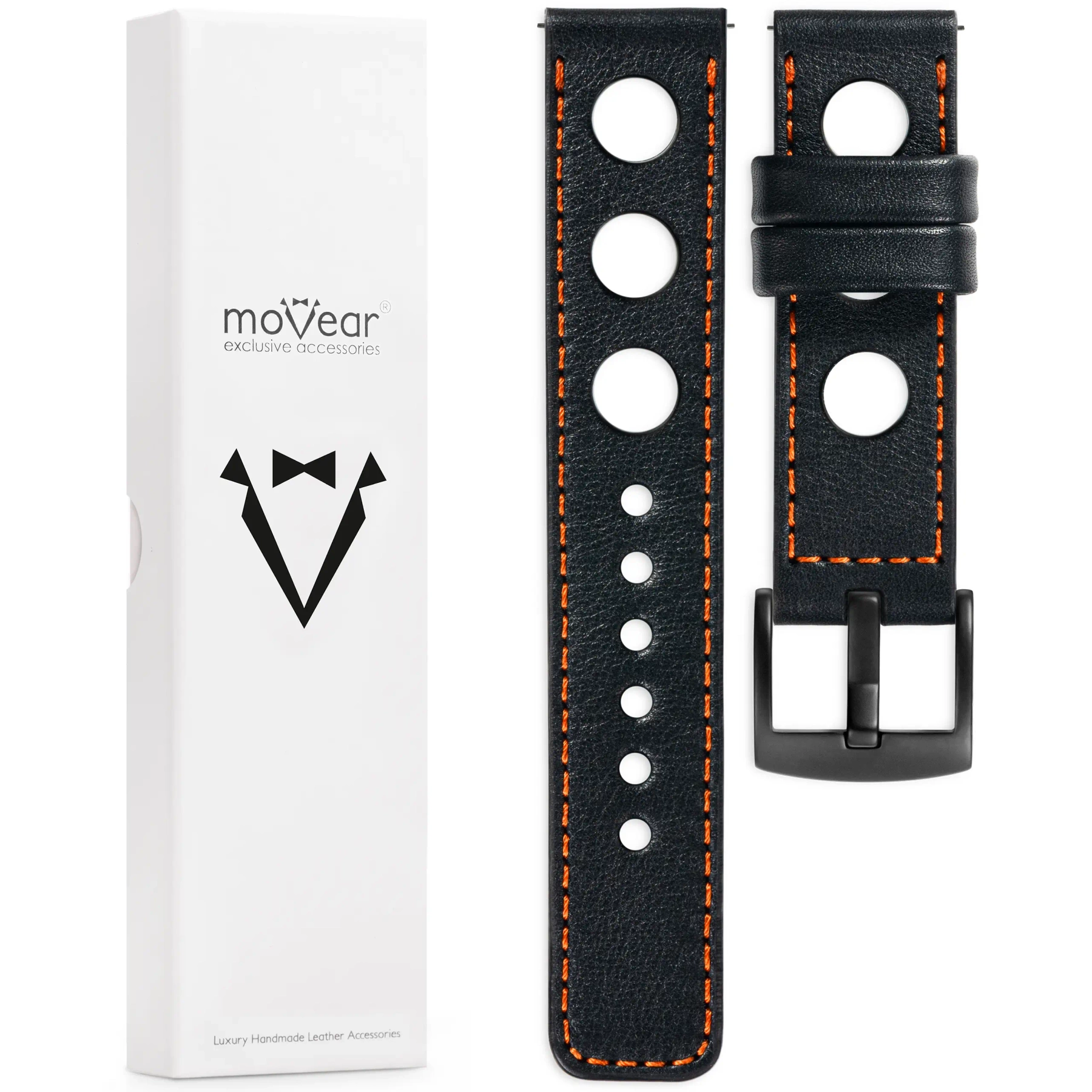 moVear Prestige R1 (Rally) Skórzany pasek 18mm do zegarka / smartwatcha | Czarny, eleganckie przeszycie kolor Ciemnopomarańczowy