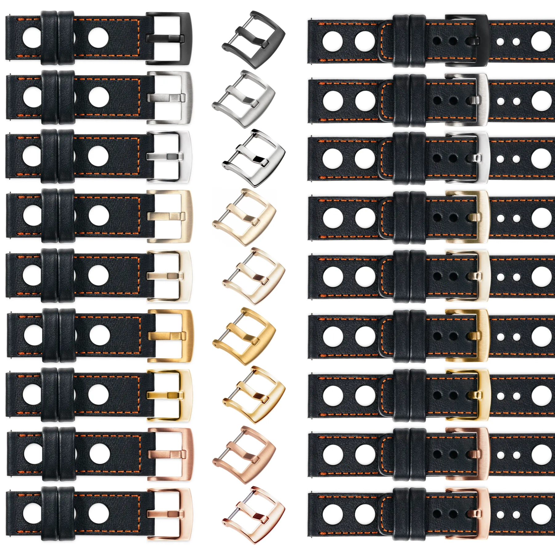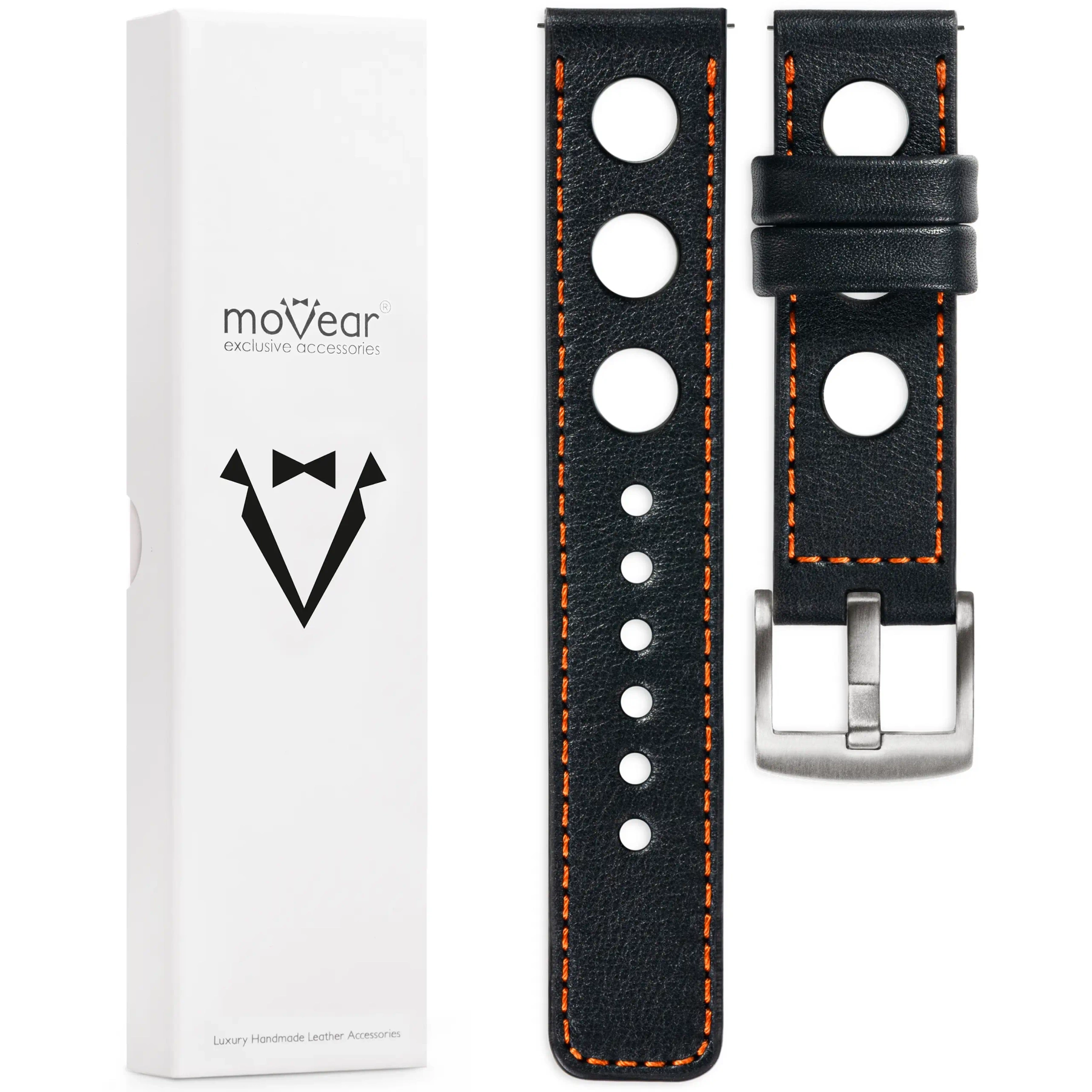 moVear Prestige R1 (Rally) Skórzany pasek 22mm do zegarka / smartwatcha | Czarny, eleganckie przeszycie kolor Ciemnopomarańczowy