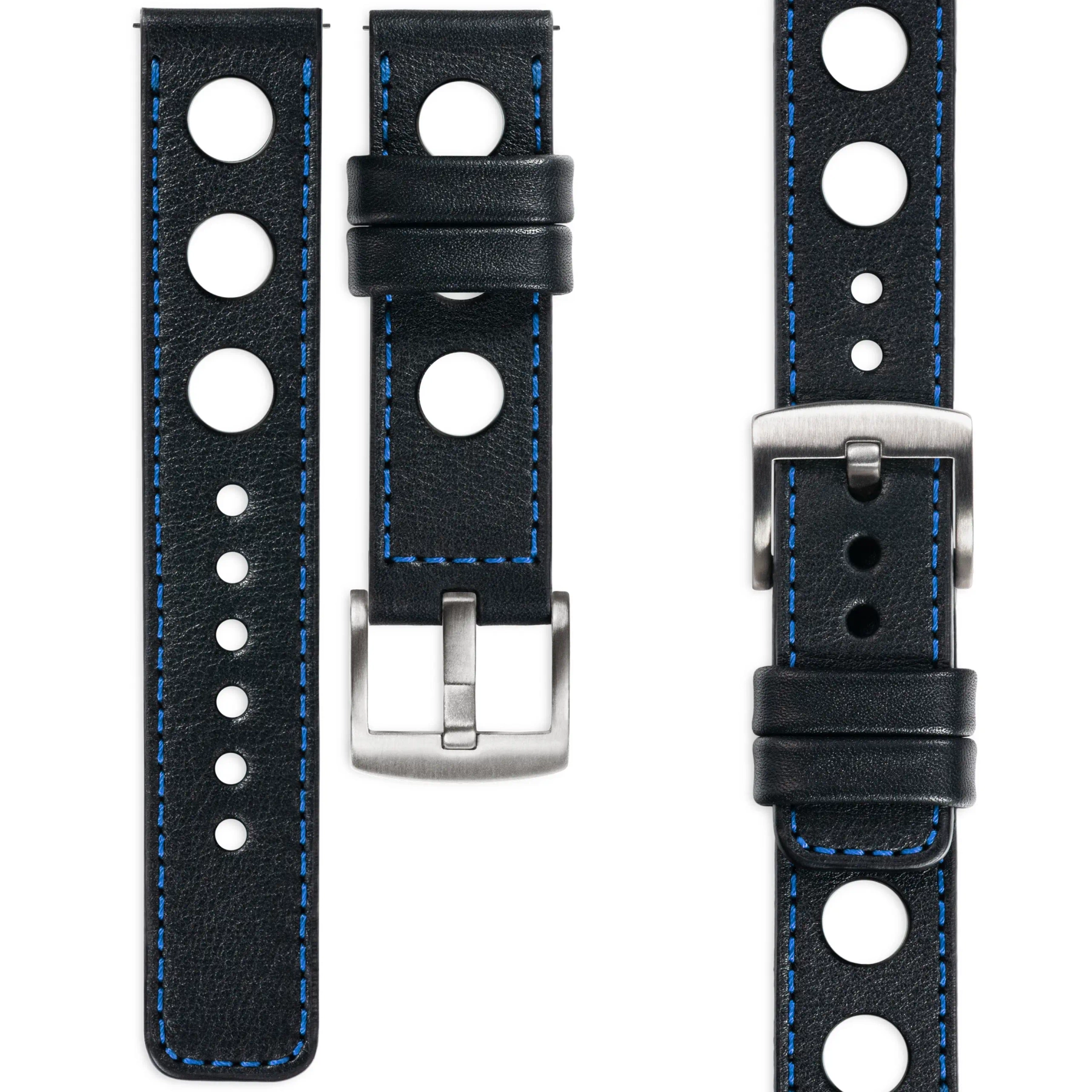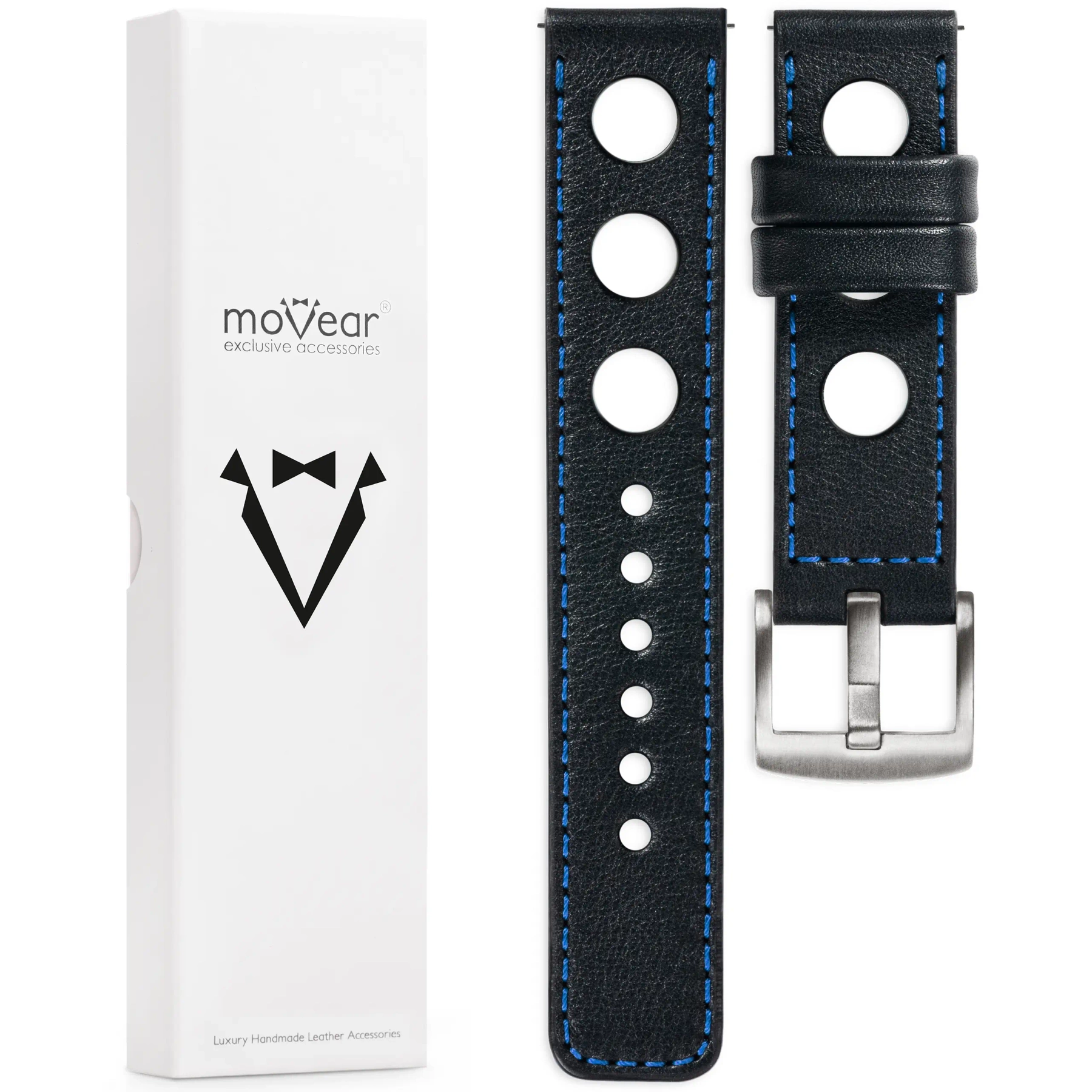 moVear Prestige R1 (Rally) Skórzany pasek 22mm do zegarka / smartwatcha | Czarny, eleganckie przeszycie kolor Niebieski