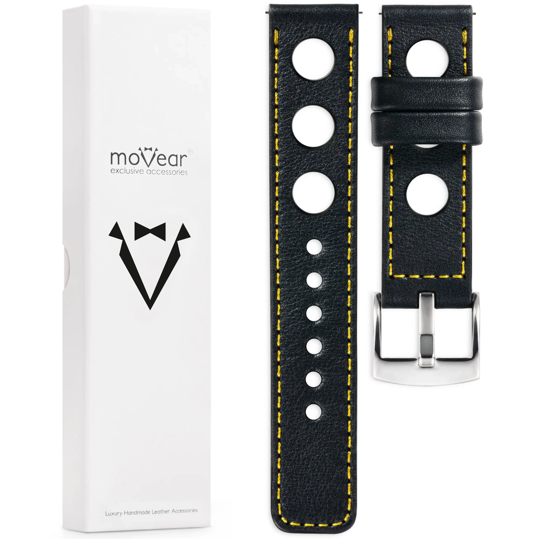 moVear Prestige R1 (Rally) Skórzany pasek 24mm do zegarka / smartwatcha | Czarny, eleganckie przeszycie kolor Żółty