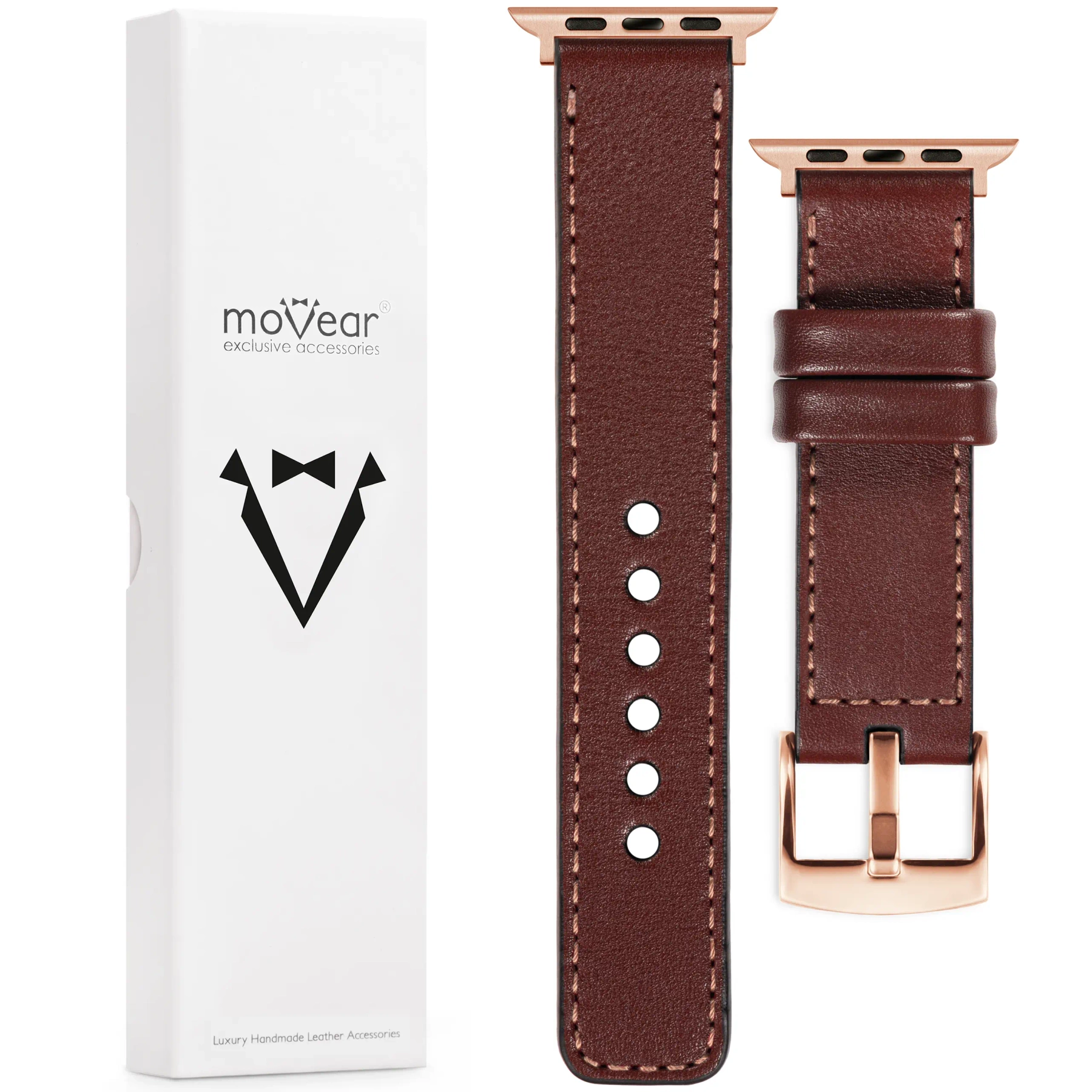 moVear Prestige C1 | Skórzany pasek 20mm do Apple Watch 10 / 9 / 8 / 7 / 6 / 5 / 4 / SE (42/41/40mm) | Kasztanowy, eleganckie przeszycie kolor Różowe złoto