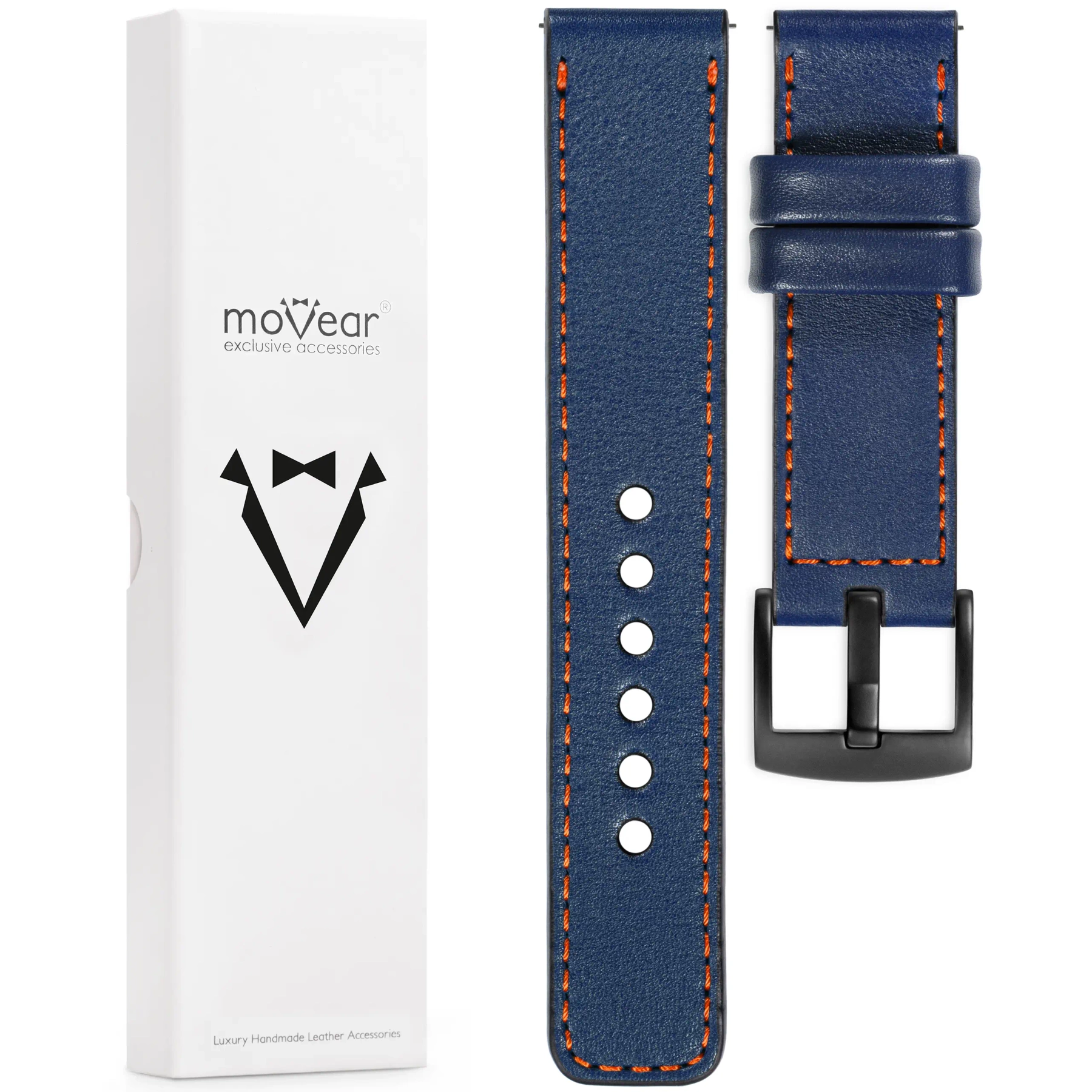 - 1 szt. moVear Prestige C1 - Skórzany pasek szerokości mocowania 26mm, kolor paska Granatowy, ciemnopomarańczowe przeszycie