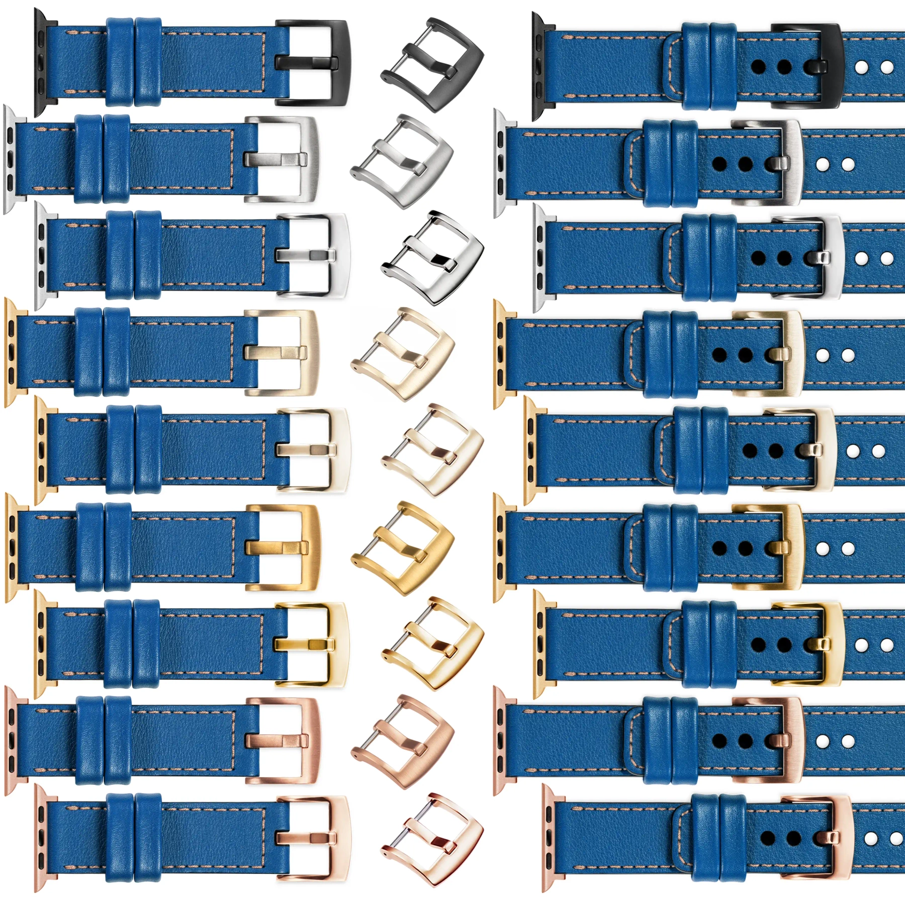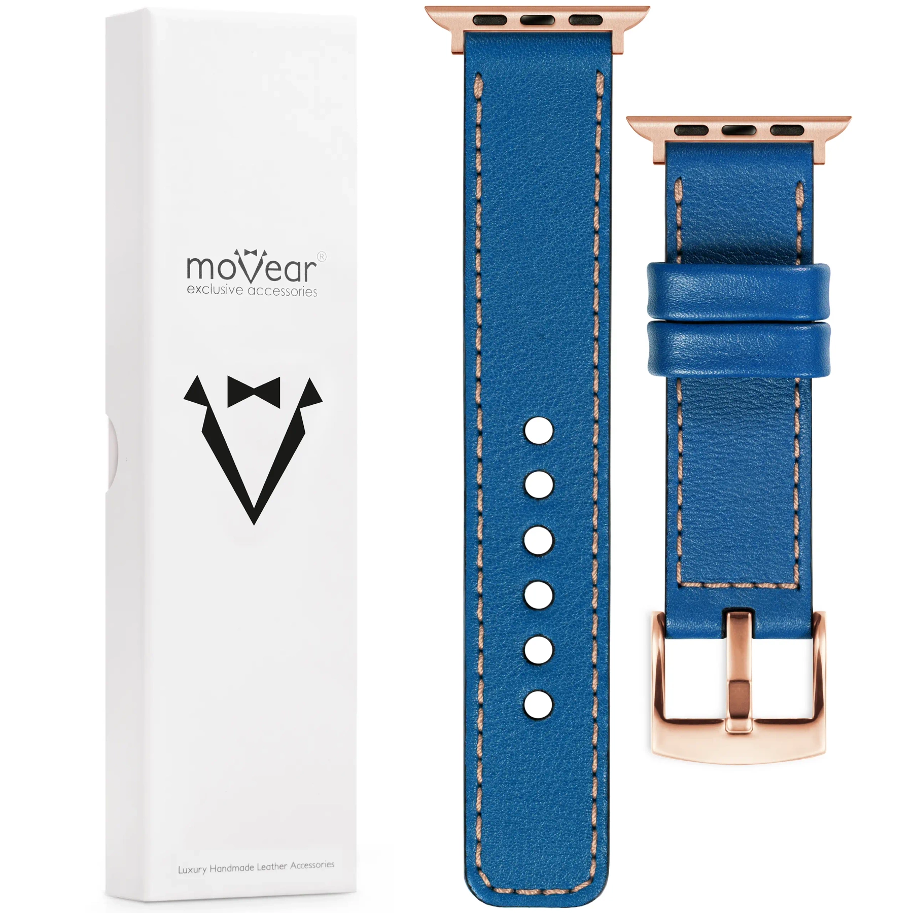 moVear Prestige C1 | Skórzany pasek 20mm do Apple Watch 10 / 9 / 8 / 7 / 6 / 5 / 4 / SE (42/41/40mm) | Niebieski, eleganckie przeszycie kolor Różowe złoto
