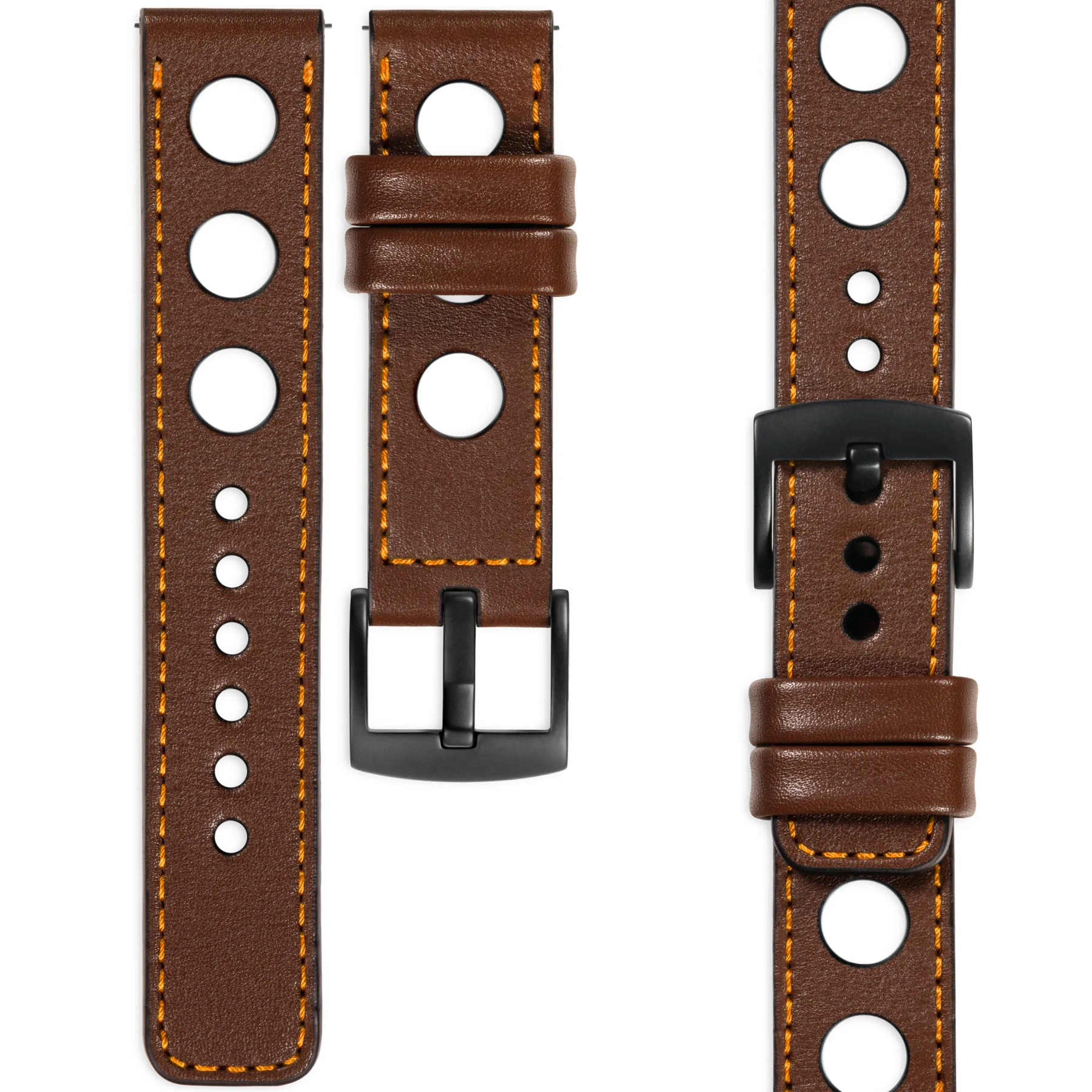 moVear Prestige R1 (Rally) Skórzany pasek 20mm do zegarka / smartwatcha | Ciemnobrązowy, eleganckie przeszycie kolor Pomarańczowy