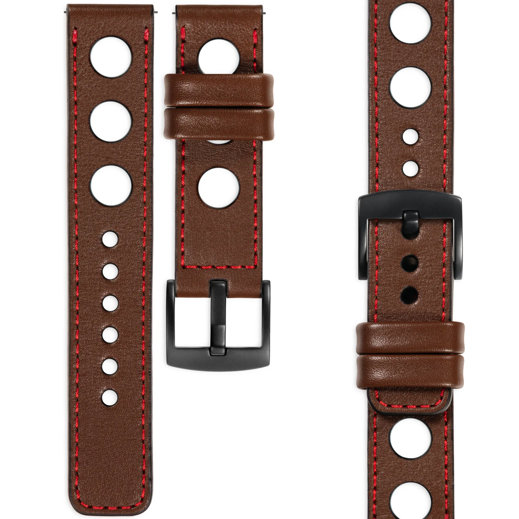 - 1 szt. moVear Prestige C1 - Skórzany pasek szerokości mocowania 22mm, kolor paska Ciemnobrązowy, przeszycie Czerwony
