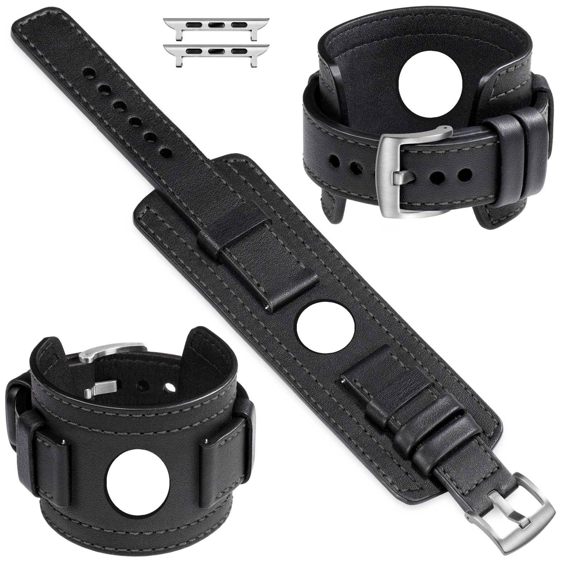 moVear Prestige CW1 szeroki skórzany pasek 20mm z podkładką do Apple Watch 10 / 9 / 8 / 7 / 6 / 5 / 4 / SE (42/41/40mm) | Czarny, eleganckie przeszycie kolor Grafitowy