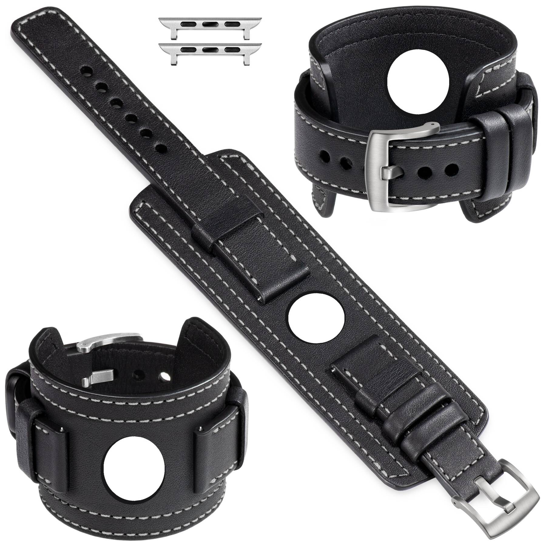 moVear Prestige CW1 szeroki skórzany pasek 20mm z podkładką do Apple Watch 10 / 9 / 8 / 7 / 6 / 5 / 4 / SE (42/41/40mm) | Czarny, eleganckie przeszycie kolor Biały