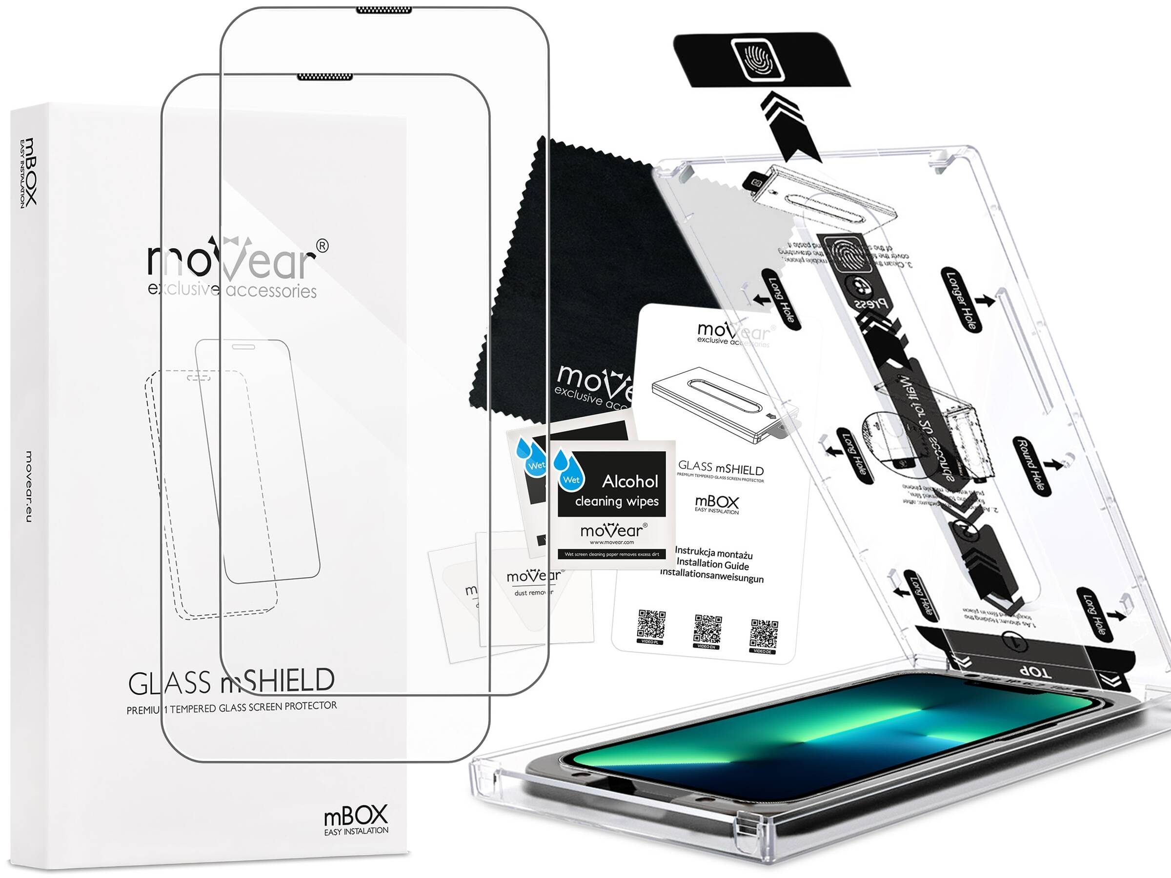 moVear mBOX GLASS mSHIELD 2.5DSzkło hartowane na Apple iPhone 16e / 14 / 13 / 13 Pro (6.1"), z systemem łatwego montażu2 sztuki szkła w opakowaniu