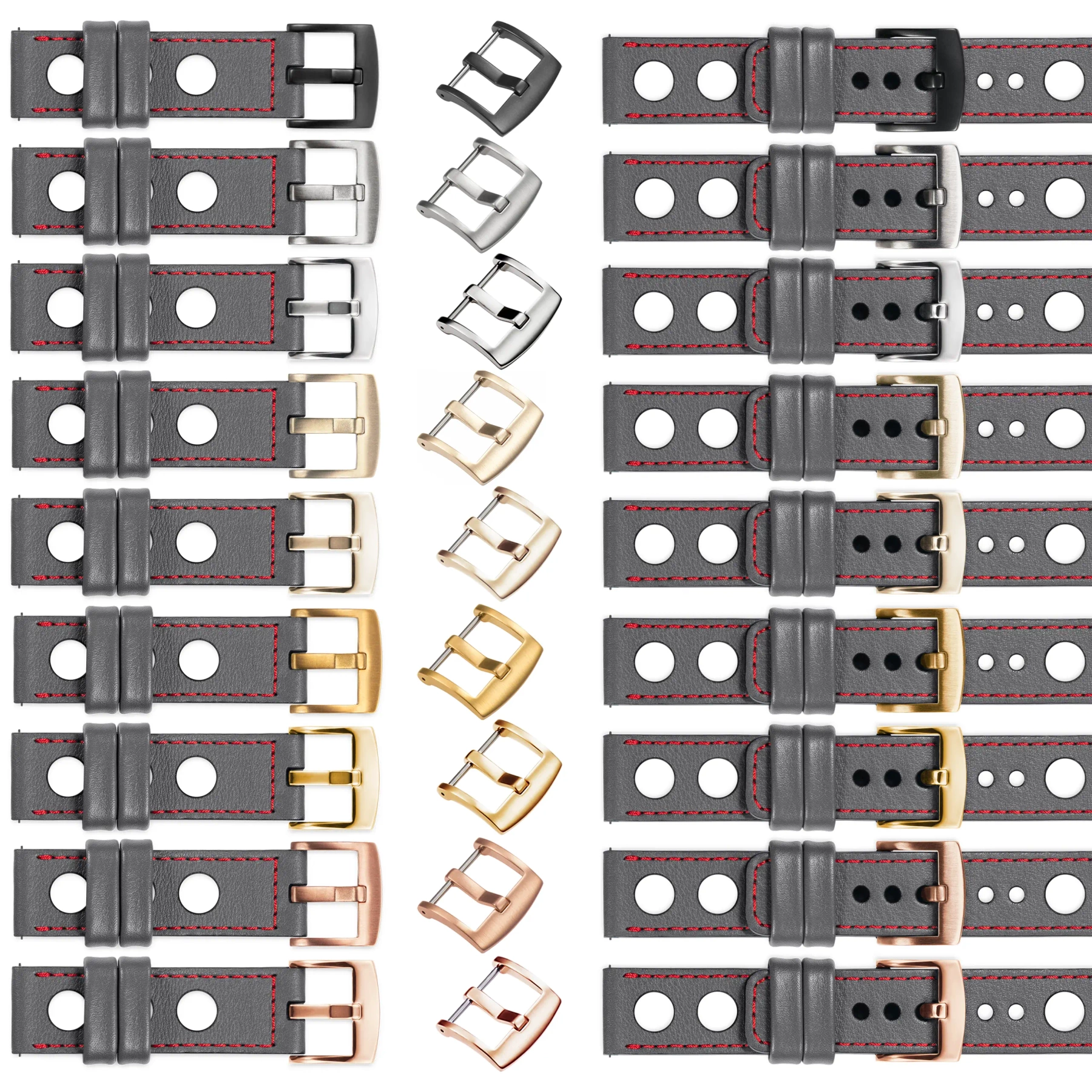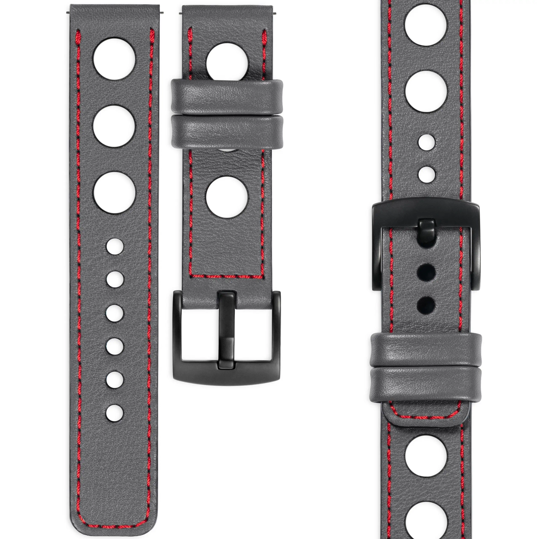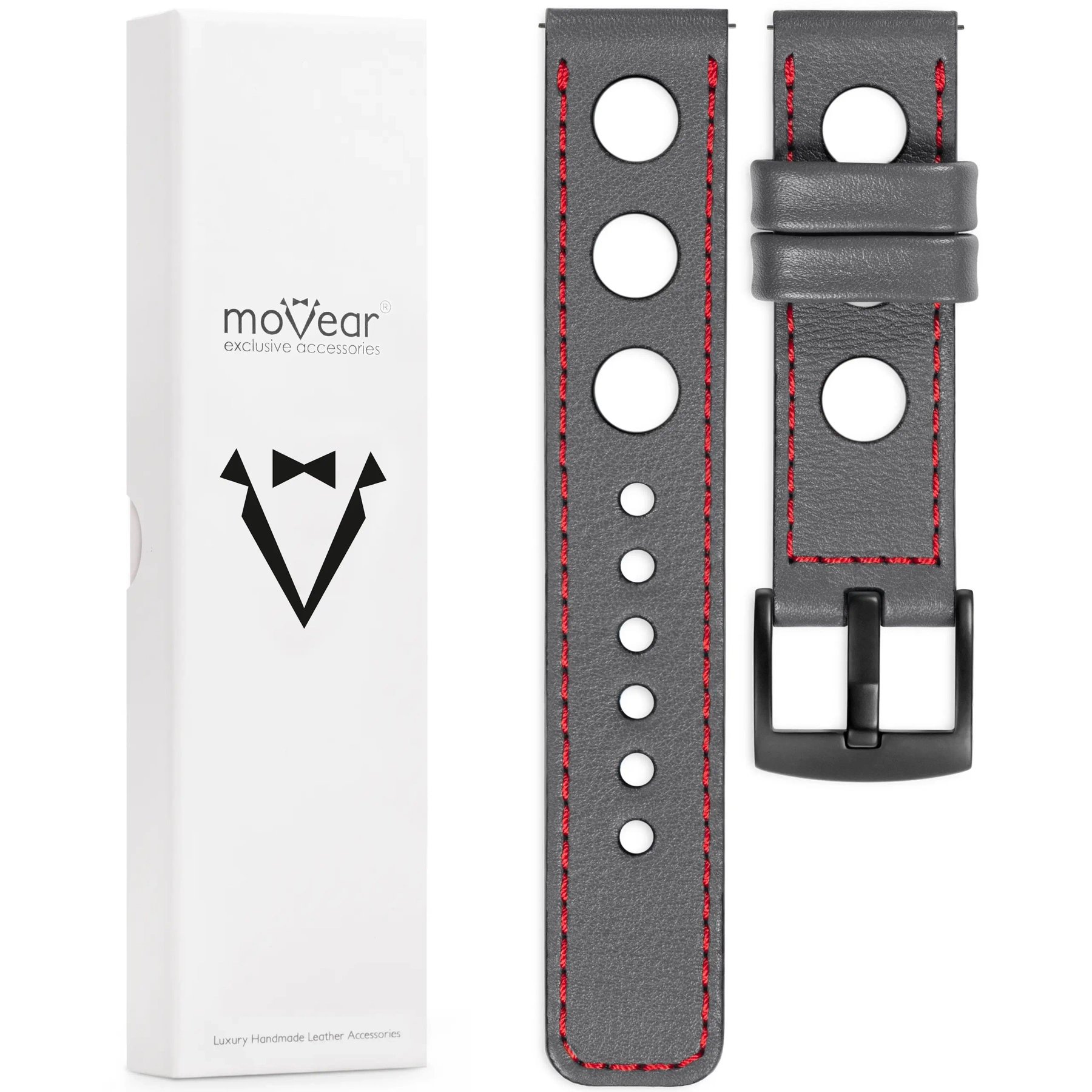 moVear Prestige R1 (Rally) Skórzany pasek 26mm do zegarka / smartwatcha | Szary, eleganckie przeszycie kolor Czerwony